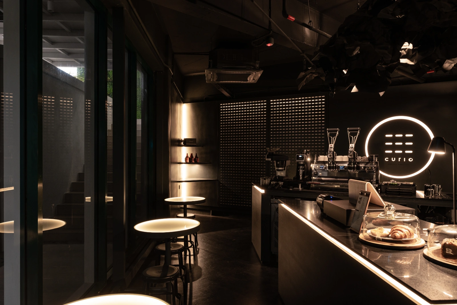 Curio Dark leverages the site’s inherent dimness as the primary design driver. External light is carefully restricted—perforated panels filter borrowed mall light, and heavily tinted glazing suppresses spill—allowing the interior to emerge subtly from shadow. The space’s low-light character shapes perception, emphasizing materiality, form, and sensory experience.