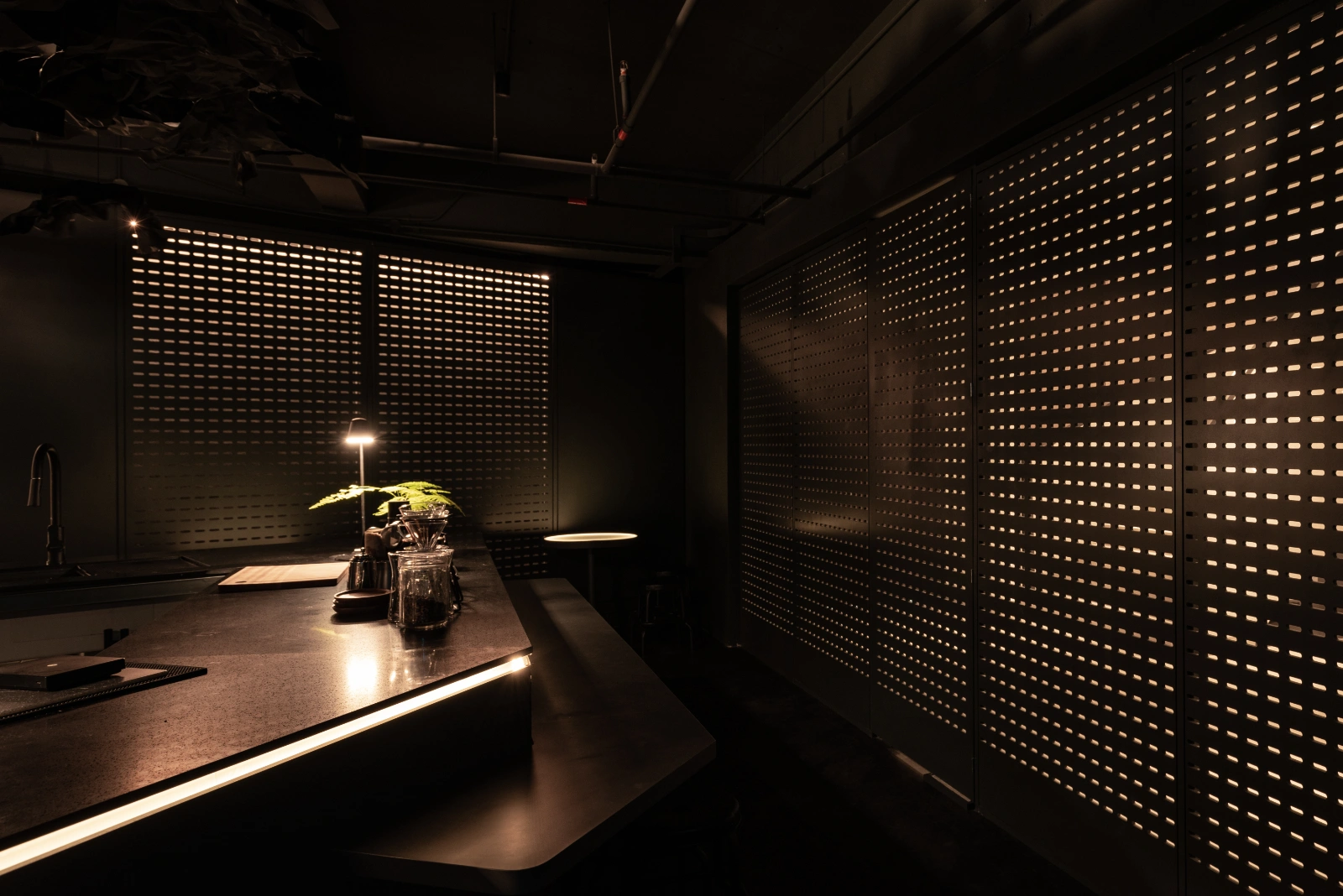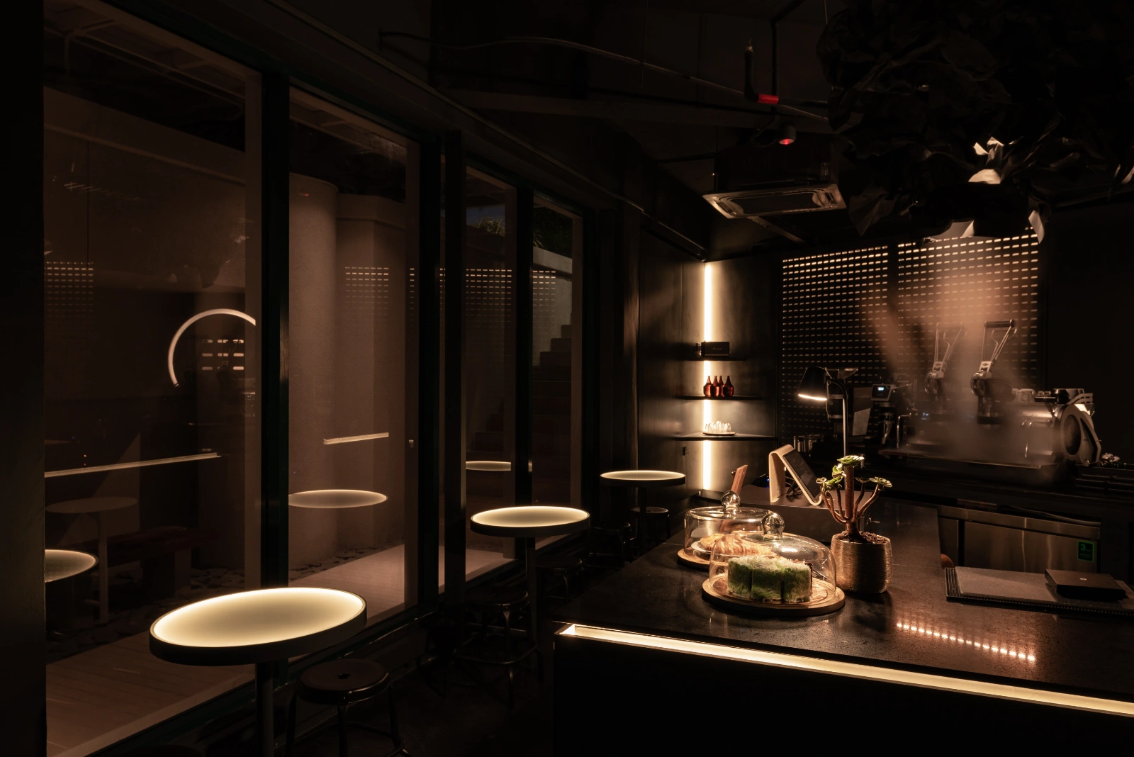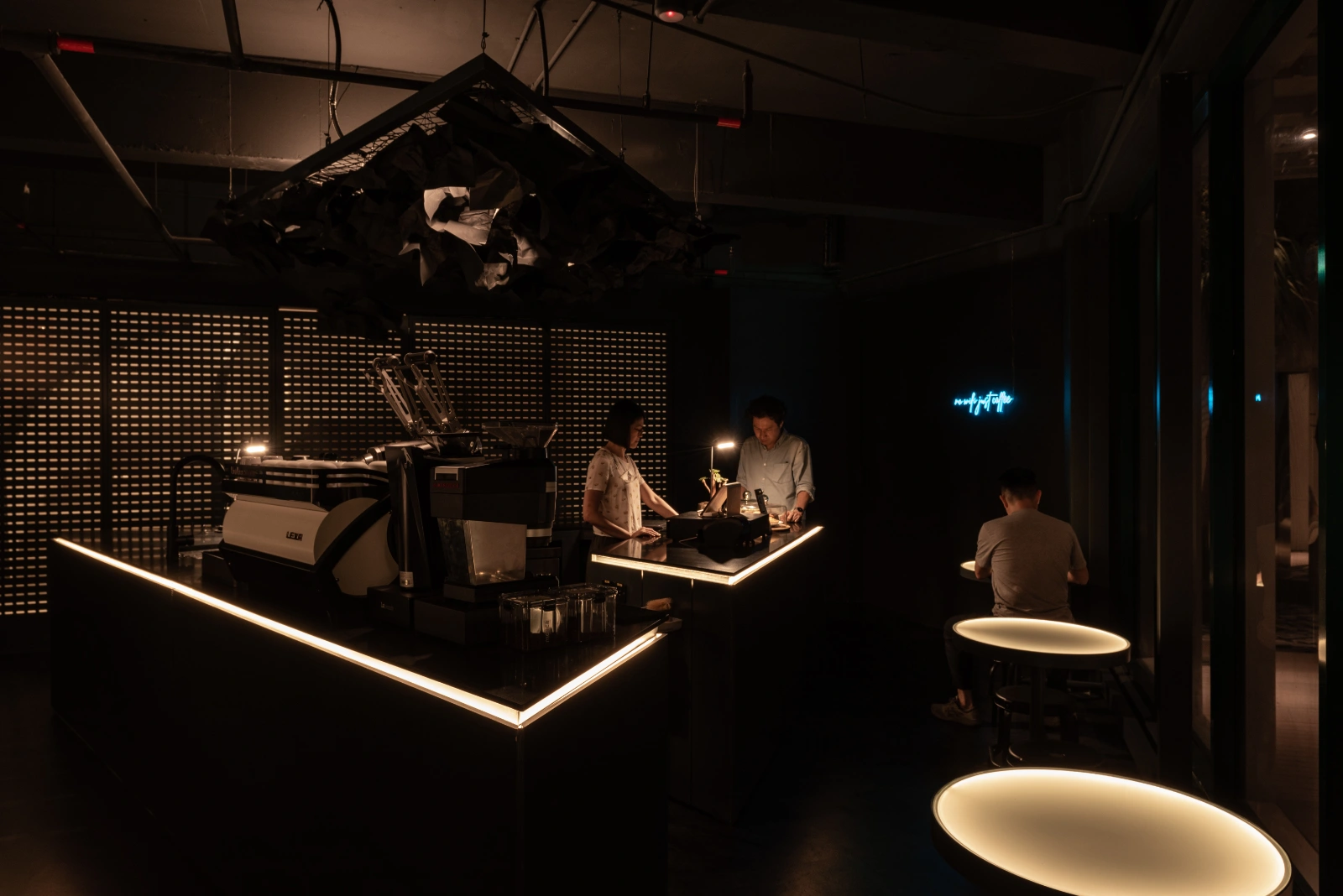 At the heart, a faceted coffee bar appears to float via concealed under-lighting, encircled by two-seater tables with integrated surface lights. A crumpled-paper “cloud” diffuses warm illumination onto the bar, preserving the space’s dim ambience. Elsewhere, subdued lighting amplifies sound, aroma, and texture, while contrasting finishes articulate a dialogue between smooth and rugged surfaces.