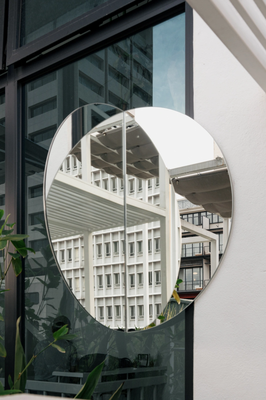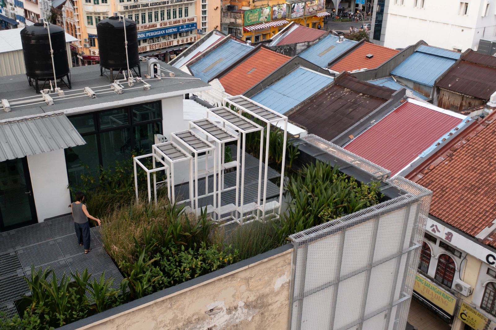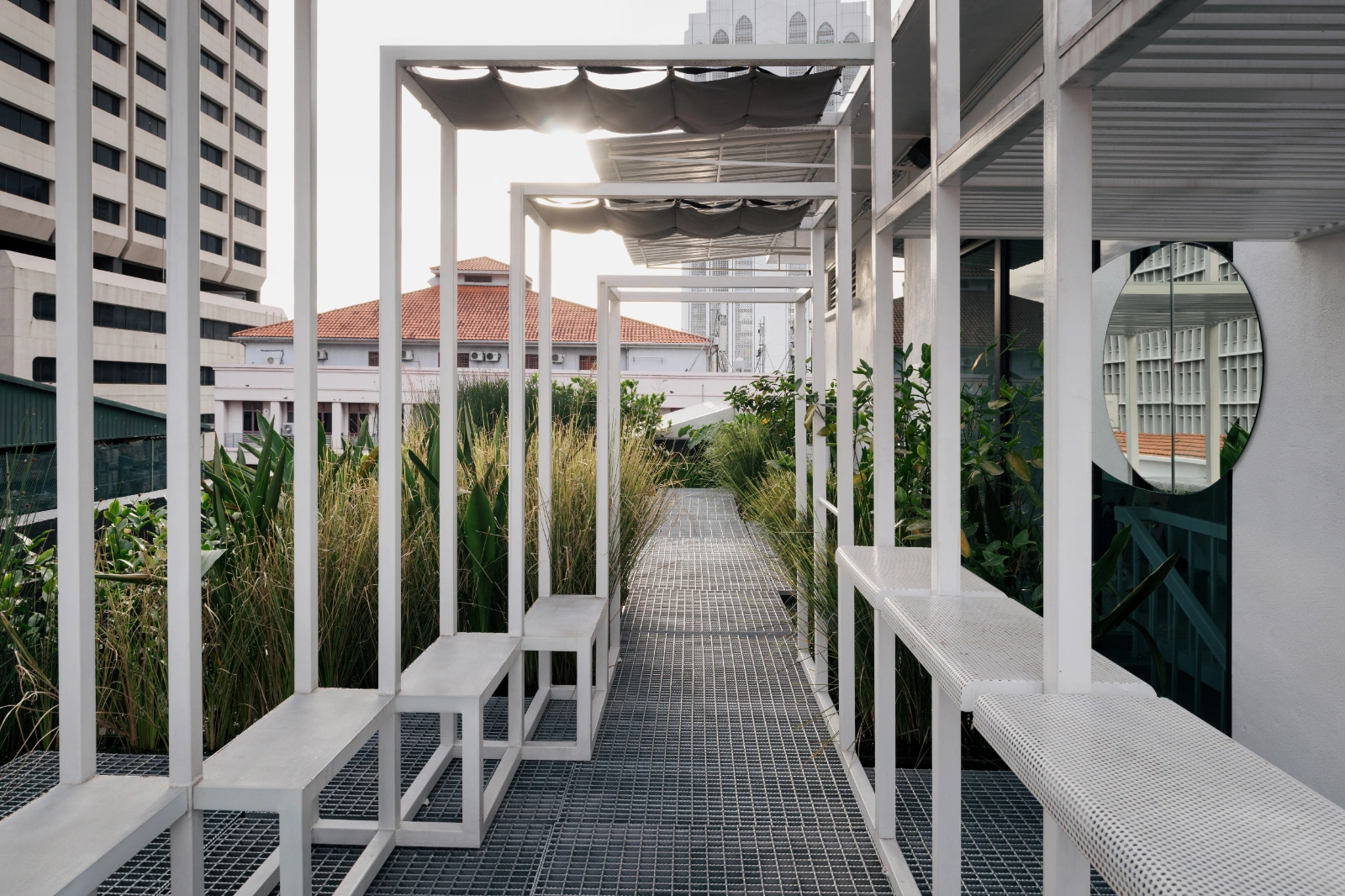 Set against the charming old KL city skyline, L5 takes the form of a monochromatic white skeleton installation, inspired by the edges of the grating set on the water. Its geometry subtly draws on the language of Frank Stella’s hard-edge painting, forming an aperture-like portal that frames the city view while still allowing the charming old city’s colorful character to remain visible.