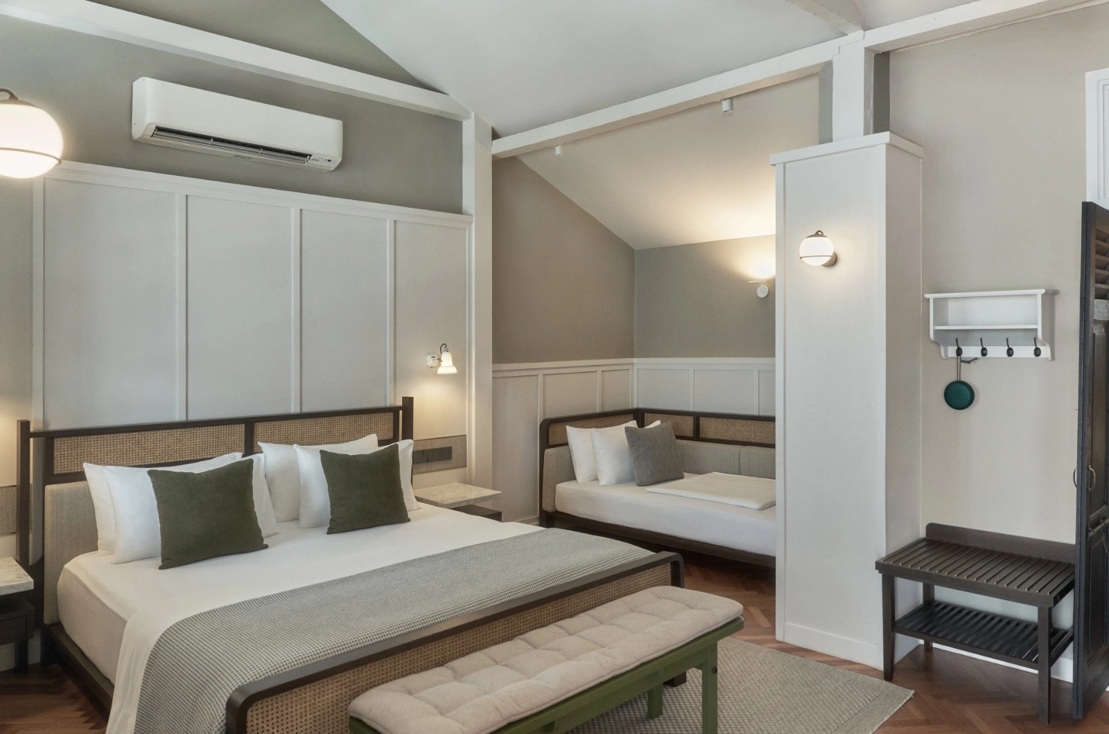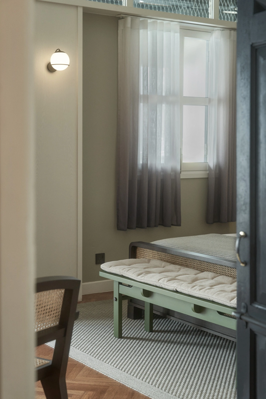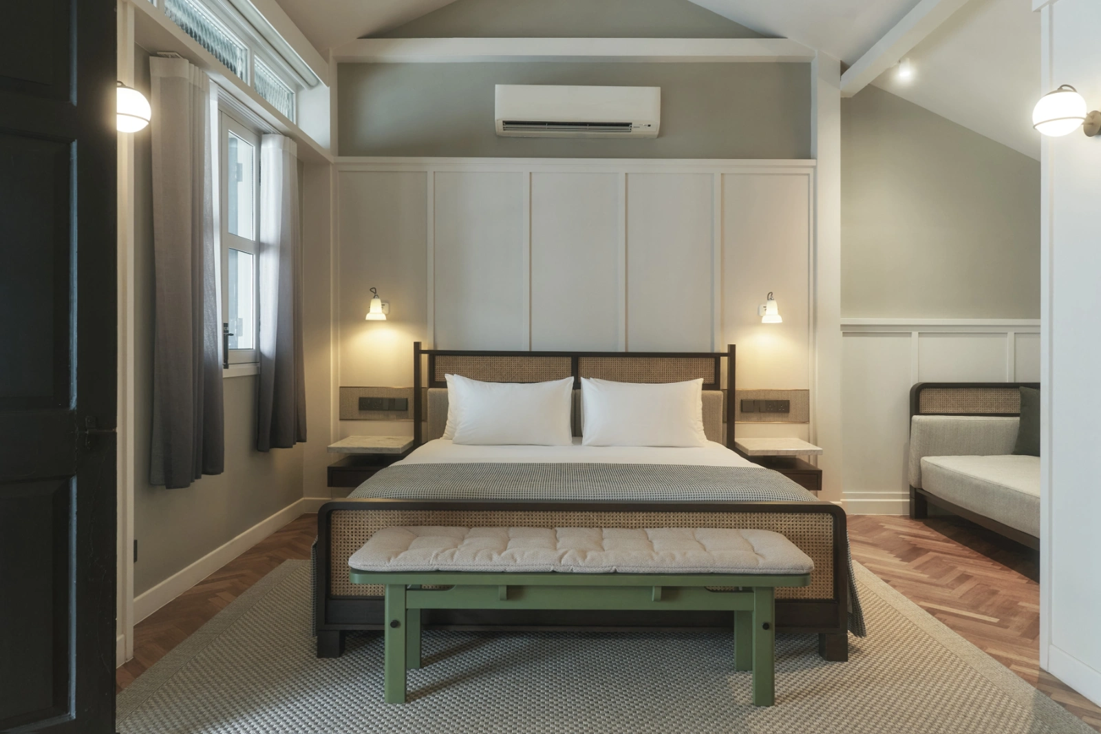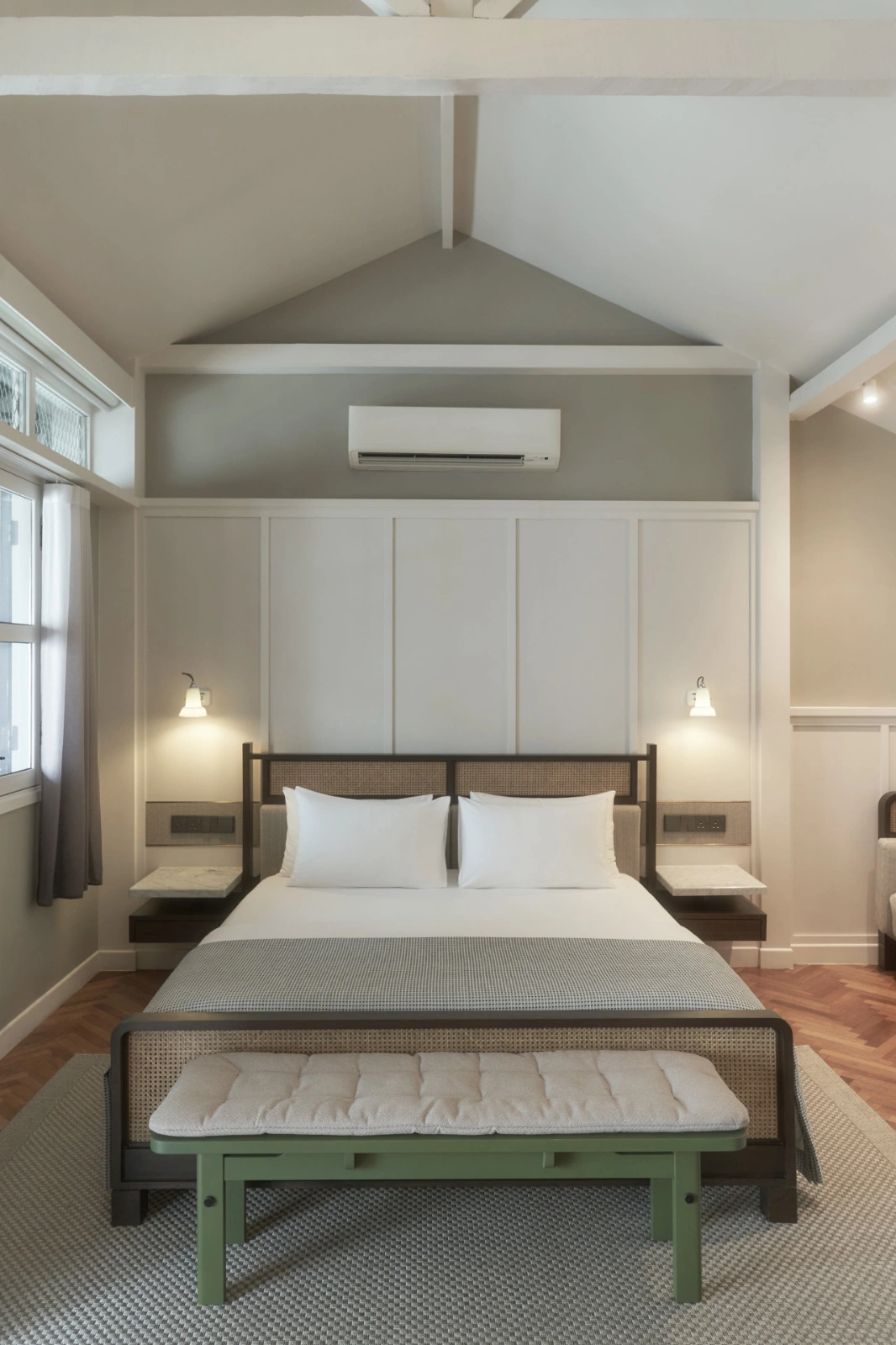 Noordin Mews, a testament to Penang’s Late Straits Eclectic architectural heritage, has stood the test of time since the 1920s. Originally a bustling shophouse and mews, its walls have witnessed the ebb and flow of history. The transformation of Noordin Mews was a meticulous process, one thatrequired both creativity and profound respect for the building’s storied past. The challenge was to preserve the rugged charm of the original structure while introducing modern amenities to enhance guest comfort. Attention to detail extended to custom-designed elements like the bespoke luggage racks and clothes hooks, reminiscent of vintage cloak hangers. These thoughtful touches ensured that each room, while distinct, resonated with the same historical charm and modern elegance. The design process was guided by a philosophy of minimal intervention, allowing the building’s natural beauty to take centre stage.