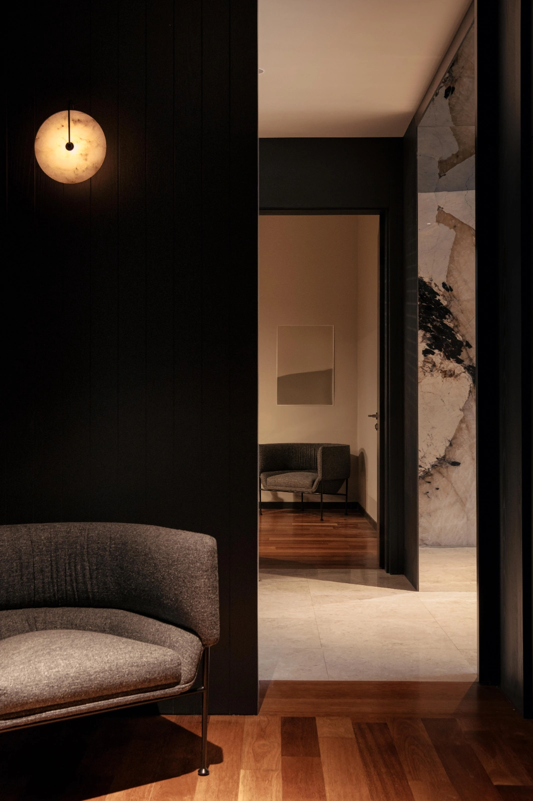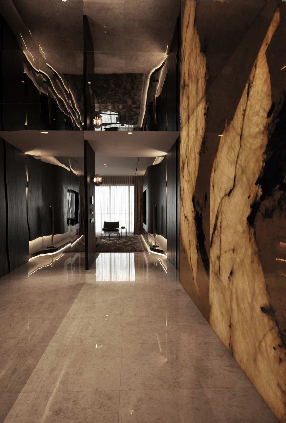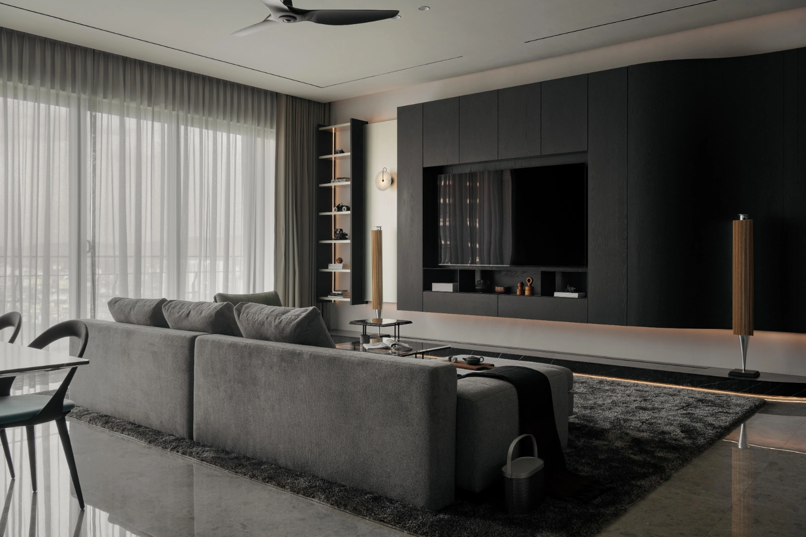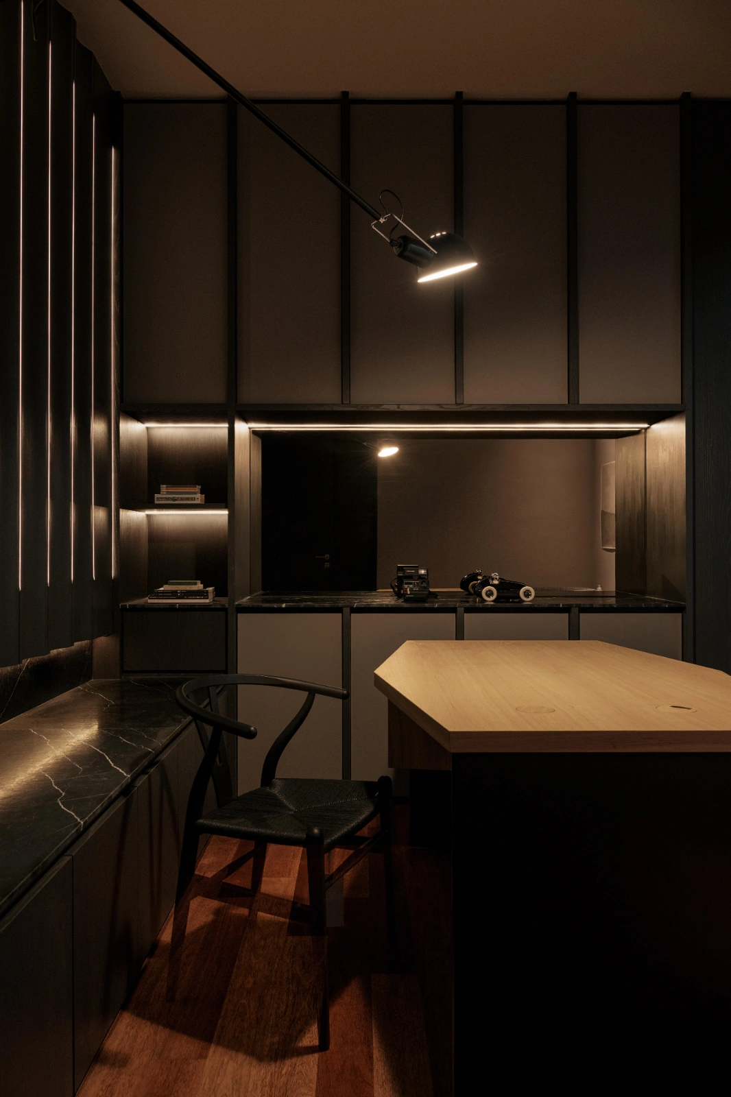 This residence is a two-in-one apartment located on Level 42 at Persiaran Stonor, just a stone’s throw from KLCC, the iconic landmark of Kuala Lumpur. The 3,000-square-foot apartment comprises a living room, dry and wet kitchens, three bedrooms, one study, and a lounge, forming a quiet framework for the atmosphere within. A moody, cinematic retreat wrapped in a dim, atmospheric glow, where deep shadows, muted tones, and sculptural light define the space. Dark ebony ash-veneered panels and soft taupe planes set the tone for a refined canvas, while warm, low illumination converges to create intimate pockets of calm. The overall atmosphere is refined, mysterious, and carries a subtle noir sensibility. From the arrival lobby just beyond the elevator, where draped lighting installations serve as a welcoming focal point, to the vestibule inside the apartment, which features a backlit crystallized quartzite granite wall arranged in deliberate asymmetry, the home is punctuated by carefully curated theatrical gestures. Softly illuminated sliding timber screens with geometric patterns introduce quiet moments of spectacle, enhancing the cinematic, noir-inspired ambience throughout. Materiality is expressed through texture and finishes—sumptuous velvet, natural stone in structured and matte finishes, and brushed metal—creating quiet tension and tactile richness, while accents in Chardonnay brushed gold punctuate the interiors with subtle drama. Each surface and finish is carefully considered, reinforcing the refined and cinematic quality of the space. Curved elements flow through the space—from the sinuous TV wall and concave fluted paneling to the gentle curves of the furniture and light fittings—echoing organic contours. These soft forms ease the boxy layout, shaping a cozy, fluid atmosphere. The home settles into a quiet drama, where each space and detail quietly reveals its presence, leaving an impression that is subtle, refined, and cinematic in essence.