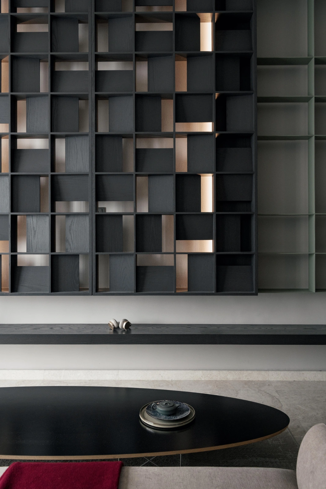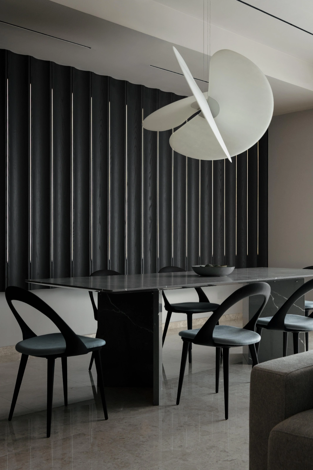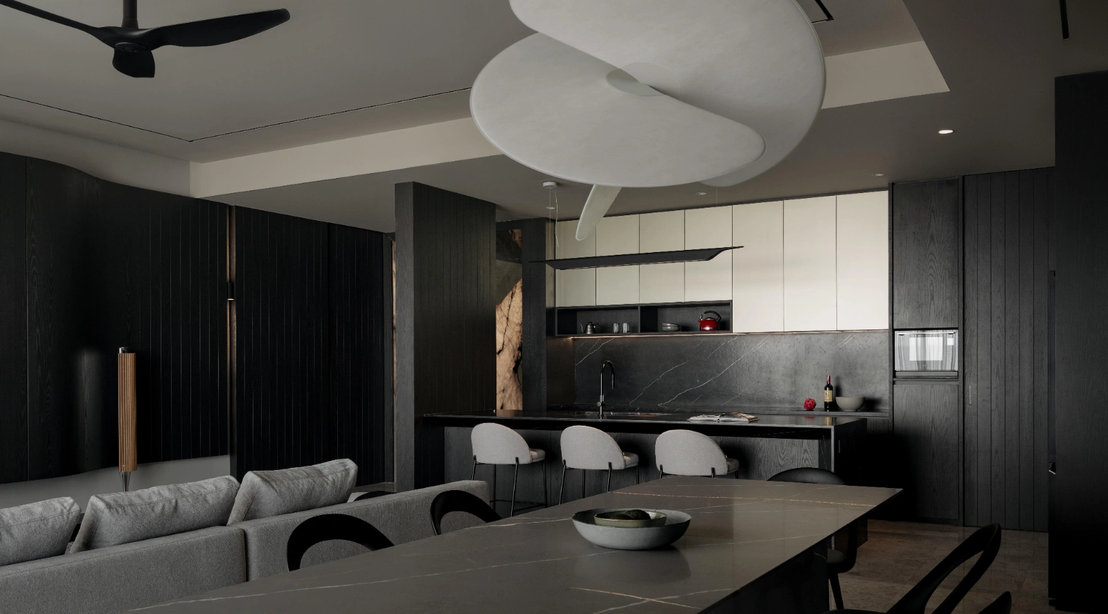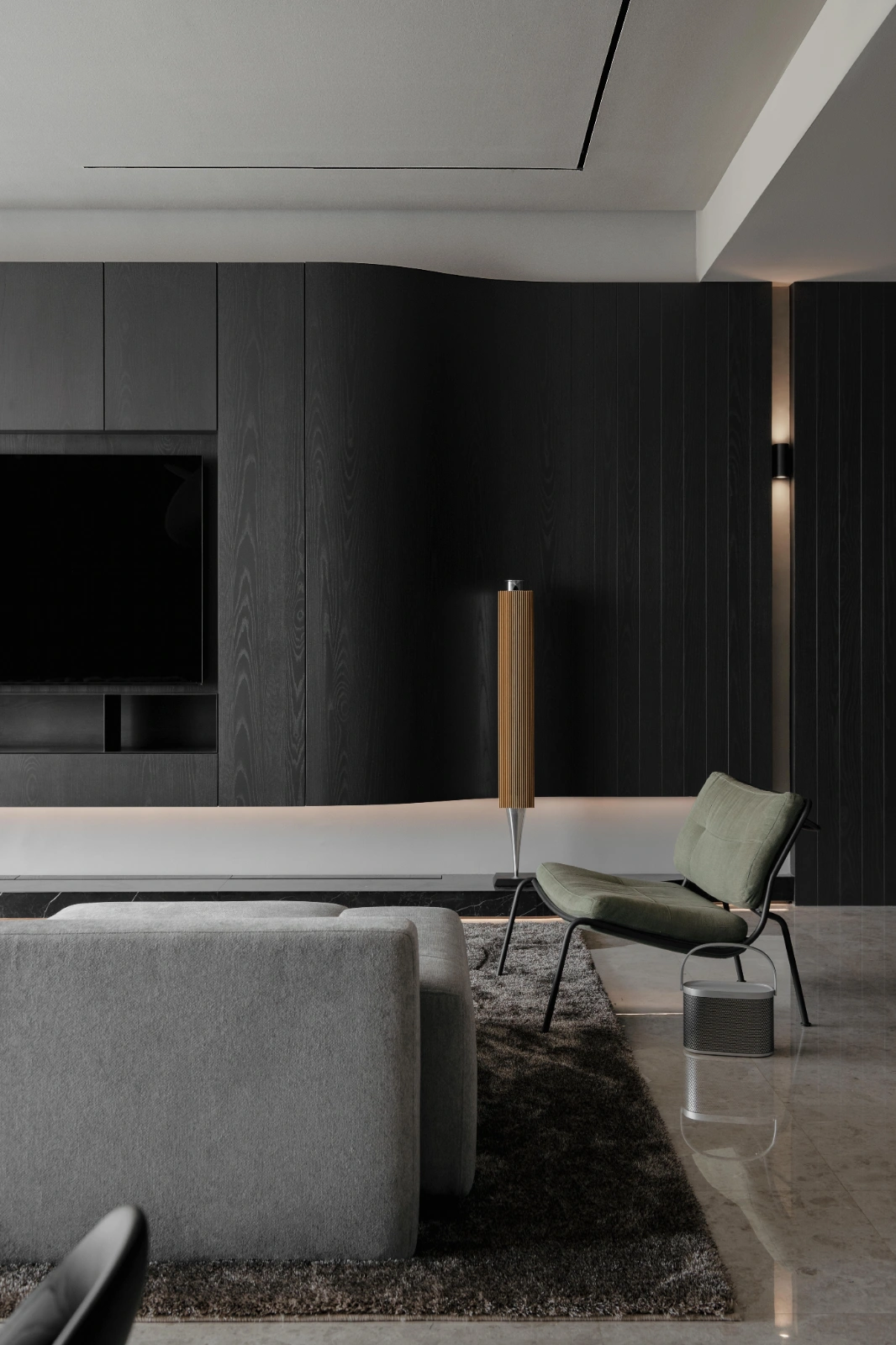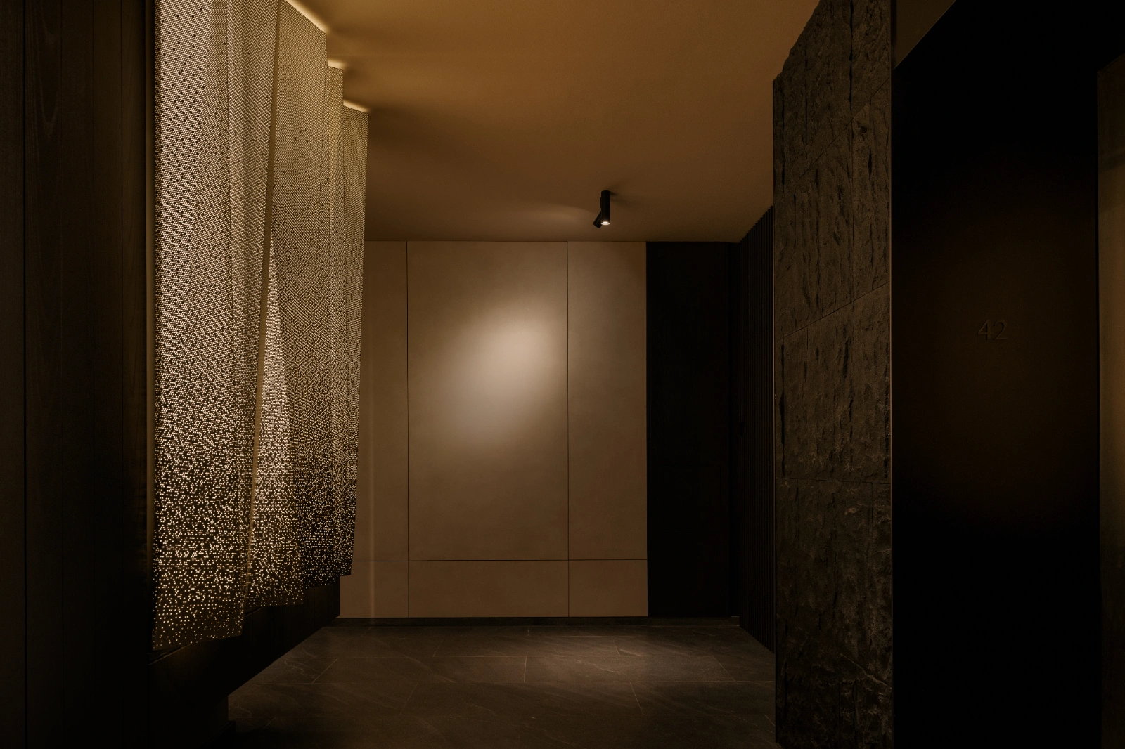 This residence is a two-in-one apartment located on Level 42 at Persiaran Stonor, just a stone’s throw from KLCC, the iconic landmark of Kuala Lumpur. The 3,000-square-foot apartment comprises a living room, dry and wet kitchens, three bedrooms, one study, and a lounge, forming a quiet framework for the atmosphere within. A moody, cinematic retreat wrapped in a dim, atmospheric glow, where deep shadows, muted tones, and sculptural light define the space. Dark ebony ash-veneered panels and soft taupe planes set the tone for a refined canvas, while warm, low illumination converges to create intimate pockets of calm. The overall atmosphere is refined, mysterious, and carries a subtle noir sensibility. From the arrival lobby just beyond the elevator, where draped lighting installations serve as a welcoming focal point, to the vestibule inside the apartment, which features a backlit crystallized quartzite granite wall arranged in deliberate asymmetry, the home is punctuated by carefully curated theatrical gestures. Softly illuminated sliding timber screens with geometric patterns introduce quiet moments of spectacle, enhancing the cinematic, noir-inspired ambience throughout. Materiality is expressed through texture and finishes—sumptuous velvet, natural stone in structured and matte finishes, and brushed metal—creating quiet tension and tactile richness, while accents in Chardonnay brushed gold punctuate the interiors with subtle drama. Each surface and finish is carefully considered, reinforcing the refined and cinematic quality of the space. Curved elements flow through the space—from the sinuous TV wall and concave fluted paneling to the gentle curves of the furniture and light fittings—echoing organic contours. These soft forms ease the boxy layout, shaping a cozy, fluid atmosphere. The home settles into a quiet drama, where each space and detail quietly reveals its presence, leaving an impression that is subtle, refined, and cinematic in essence.