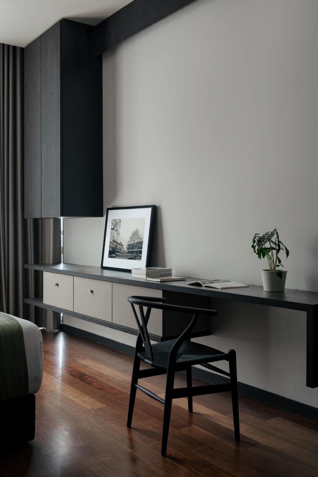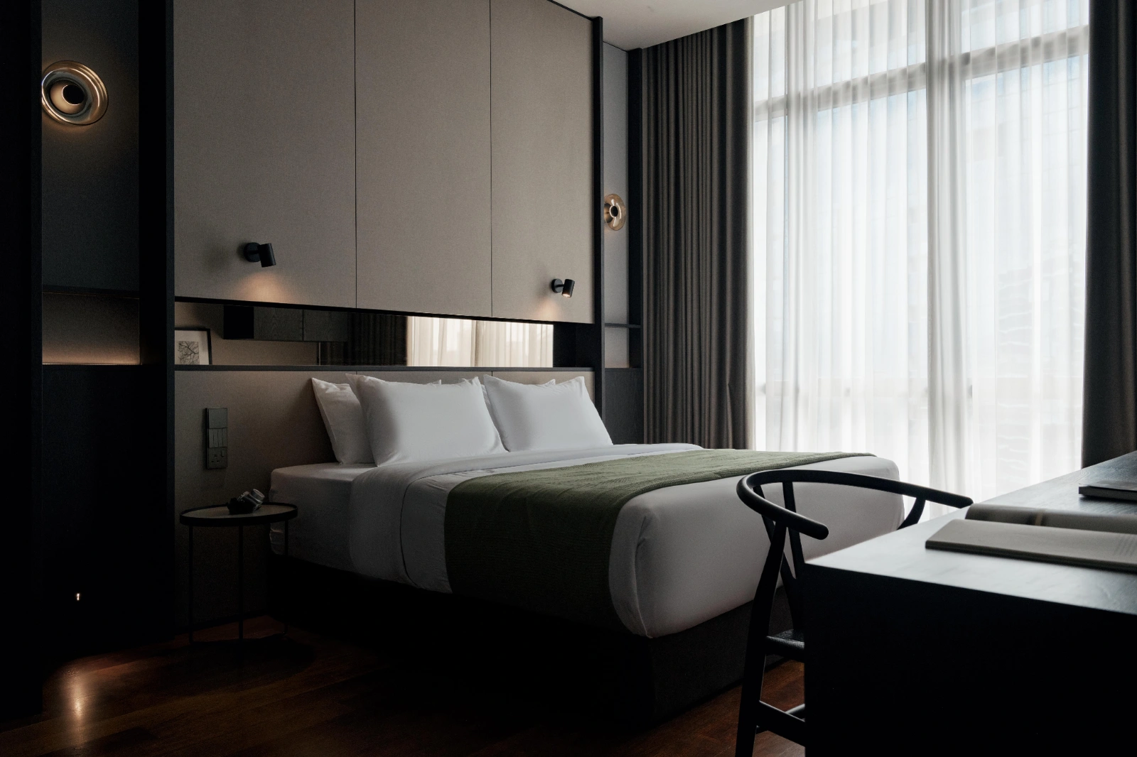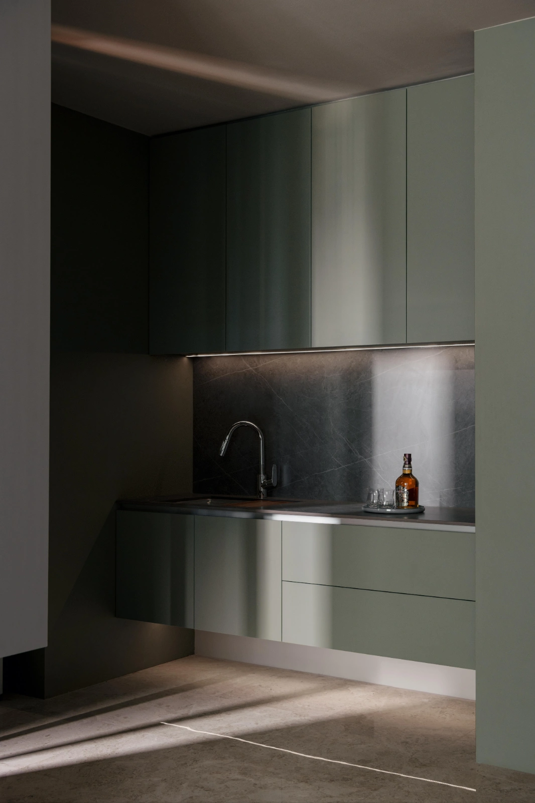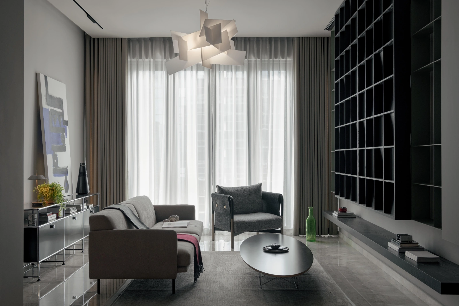 This residence is a two-in-one apartment located on Level 42 at Persiaran Stonor, just a stone’s throw from KLCC, the iconic landmark of Kuala Lumpur. The 3,000-square-foot apartment comprises a living room, dry and wet kitchens, three bedrooms, one study, and a lounge, forming a quiet framework for the atmosphere within. A moody, cinematic retreat wrapped in a dim, atmospheric glow, where deep shadows, muted tones, and sculptural light define the space. Dark ebony ash-veneered panels and soft taupe planes set the tone for a refined canvas, while warm, low illumination converges to create intimate pockets of calm. The overall atmosphere is refined, mysterious, and carries a subtle noir sensibility. From the arrival lobby just beyond the elevator, where draped lighting installations serve as a welcoming focal point, to the vestibule inside the apartment, which features a backlit crystallized quartzite granite wall arranged in deliberate asymmetry, the home is punctuated by carefully curated theatrical gestures. Softly illuminated sliding timber screens with geometric patterns introduce quiet moments of spectacle, enhancing the cinematic, noir-inspired ambience throughout. Materiality is expressed through texture and finishes—sumptuous velvet, natural stone in structured and matte finishes, and brushed metal—creating quiet tension and tactile richness, while accents in Chardonnay brushed gold punctuate the interiors with subtle drama. Each surface and finish is carefully considered, reinforcing the refined and cinematic quality of the space. Curved elements flow through the space—from the sinuous TV wall and concave fluted paneling to the gentle curves of the furniture and light fittings—echoing organic contours. These soft forms ease the boxy layout, shaping a cozy, fluid atmosphere. The home settles into a quiet drama, where each space and detail quietly reveals its presence, leaving an impression that is subtle, refined, and cinematic in essence.